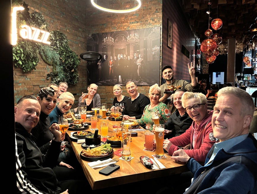 Am Abend feierten unsere Paare den erfolgreichen Turniertag gemeinsam mit vielen Tanzfreunden im Jazz Café, wo Ulf für die große Runde einen langen Tisch organisiert hatte. Entgegen der Erwartung einer eher dunklen Kellerkneipe empfing die Gäste ein modernes Restaurant mit angenehmem Ambiente und dezenter Musik, und es wurde ein wundervoller fröhlicher Abend.
