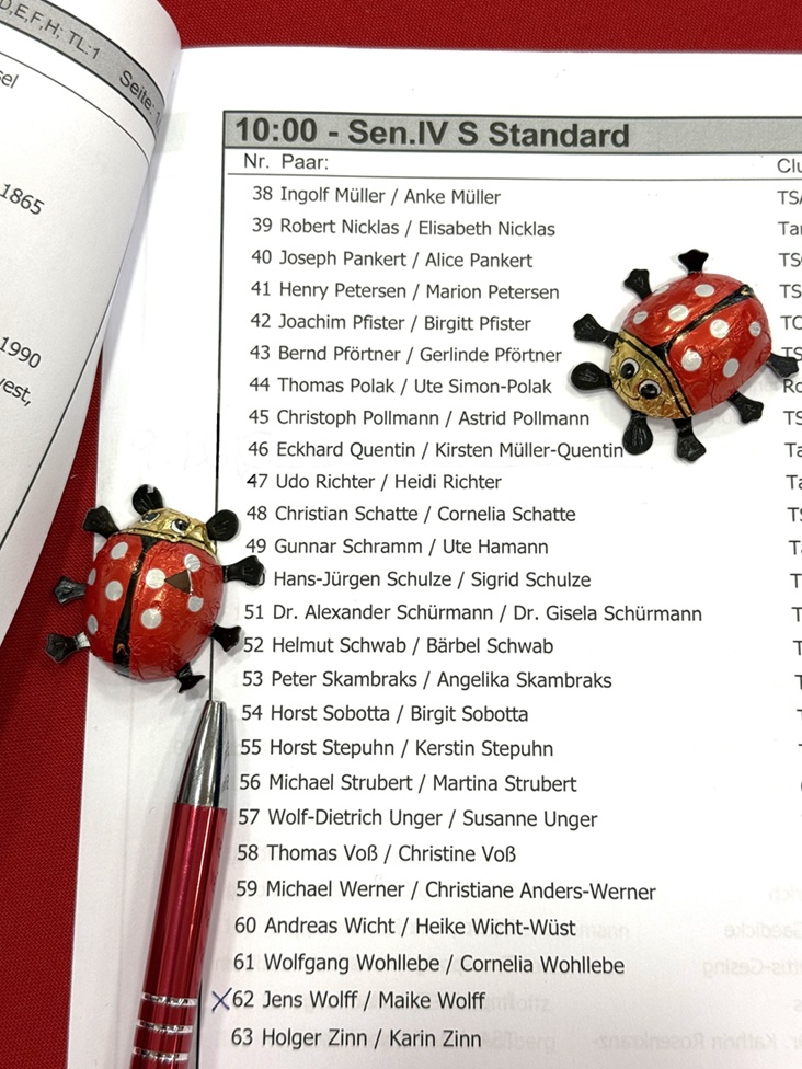 Michi und Mario hatten aufgrund der exzellenten Vorleistungen eines der begehrten Sternchen und durften daher das ausgedehnte Hotelfrühstück in aller Ruhe genießen. Anschließend feuerten sie vom Parkettrand aus ihre Clubfreunde Ulf und Doris an, die bereits voller Motivation und gut vorbereitet die Vorrunde absolvierten.