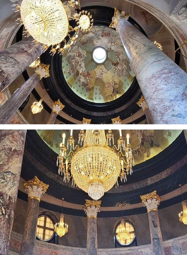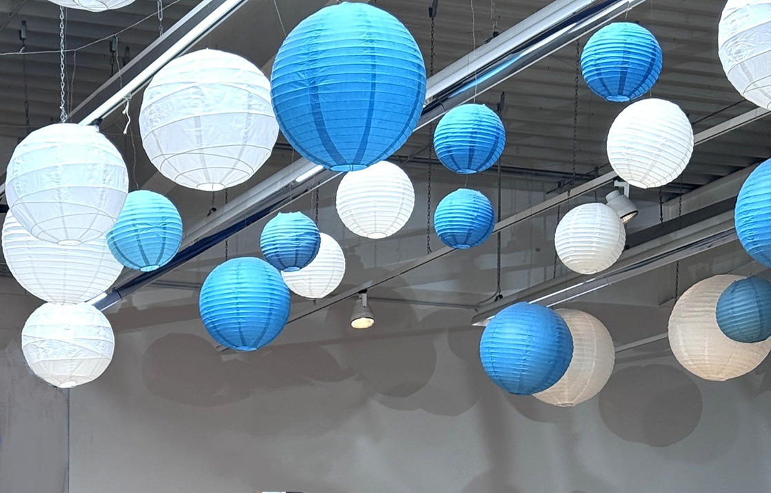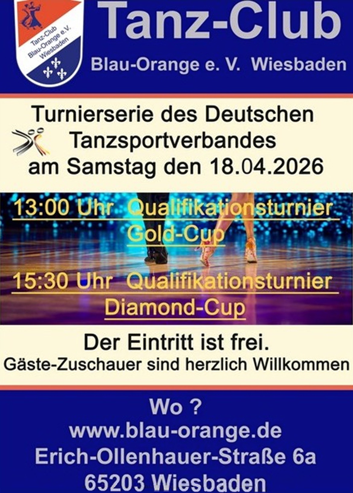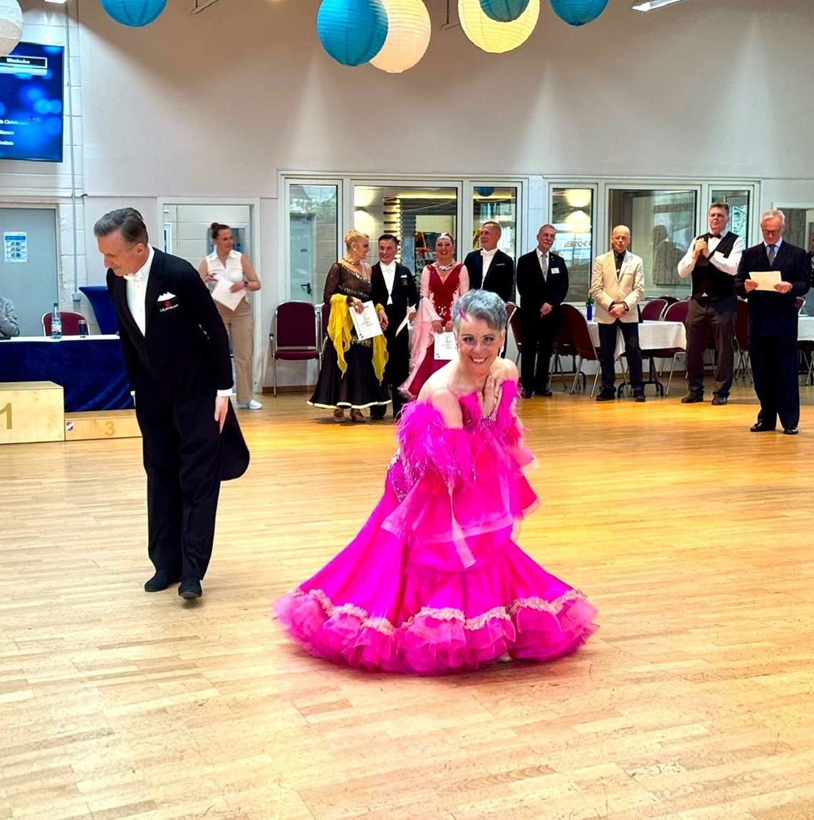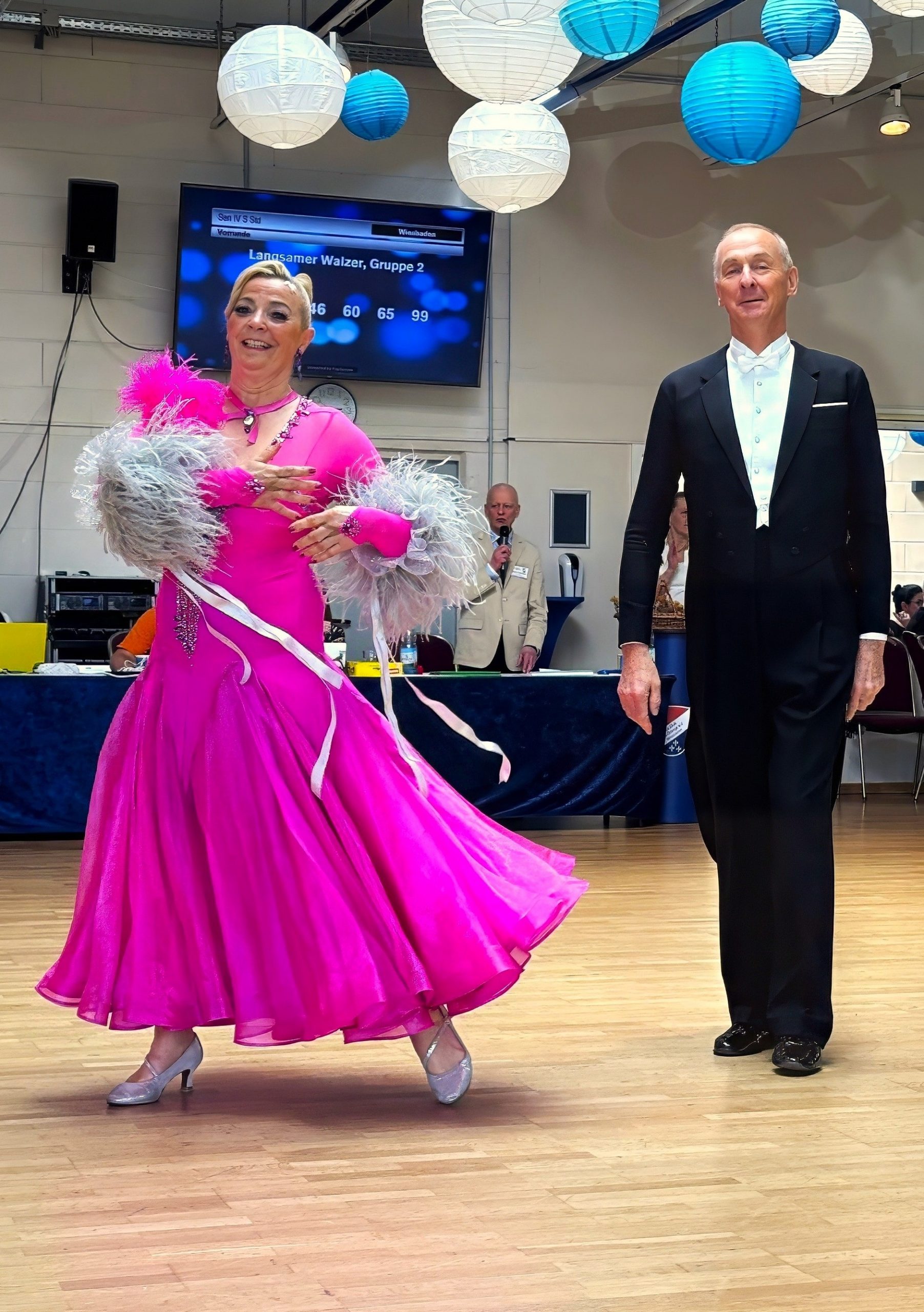 Am nächsten Morgen traf sich ein Teil unserer Clubdelegation beim Frühstück mit den Hamburger Tanzfreunden Peter und Angelika Skambraks, als Fotografin allseits bekannt unter dem Pseudonym Skampi. Danach ging es schnurstracks zum Veranstaltungsort des Diamond Cups, wo man sich gutgelaunt gemeinsam auf das Qualifikationsturnier mit 24 Paaren aus 10 Landesverbänden vorbereitete. Die fröhliche Atmosphäre im Wiesbadener Traditionsclub Blau-Orange wurde durch einen Himmel von weißen und blauen Lampion-Kugeln betont.