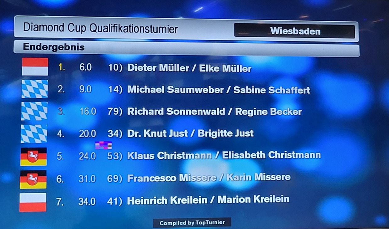 Nach einer Eintanzrunde zum Diamond Cup sollte dessen erste Vorrunde eigentlich pünktlich beginnen. Doch die Rundenauslosung im Programm TopTurnier passte nicht mit dem Papierausdruck zusammen, und es musste neu gelost werden. So ging es mit fast einer halben Stunde Verspätung in die beiden Vorrunden, die bei dieser Serie bekanntlich immer von allen Paaren bestritten werden dürfen.