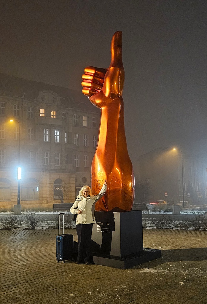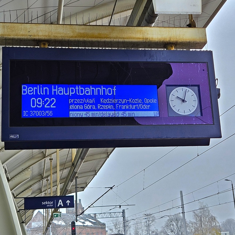 endlich im Berliner Ostbahnhof, wo gottlob der Anschlusszug nach Polen noch erreicht wurde, da auch dieser gehörige Verspätung hatte. Nach beinahe sieben Stunden in einem auf den Gängen ebenso wie im Abteil total überfüllten Waggon fuhr man bei Nacht und Nebel auf dem gespenstisch menschenleeren Bahnhof Gliwice ein.