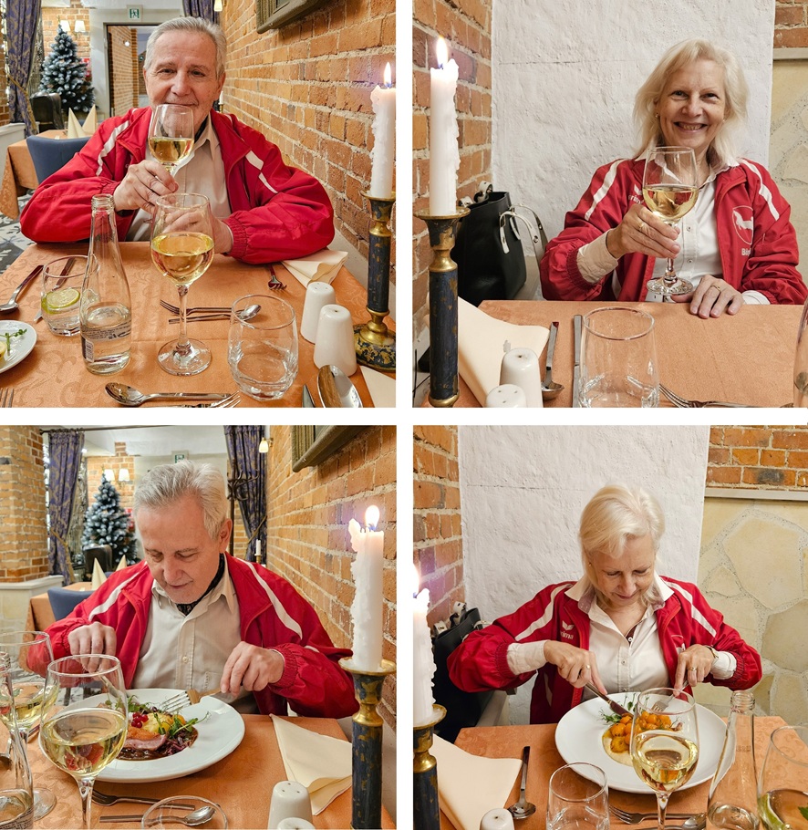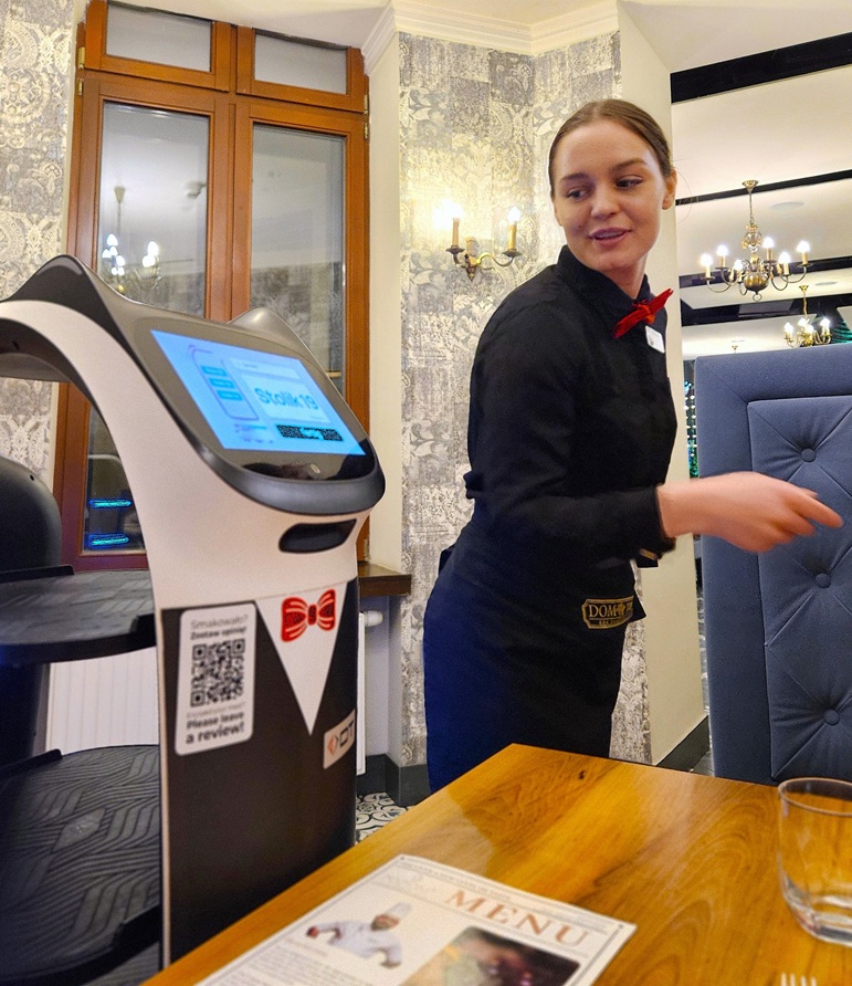 Der fuhr sie zurück ins Hotel Diament, wollte allerdings erst den Weg zu dem gleichnamigen Hotel im 50 km entfernten Katowice nehmen, wovon man ihn rechtzeitig abbringen konnte. Endlich angekommen hatten unsere beiden natürlich gehörigen Hunger. Der KI-gesteuerte Serviergehilfe auf Rädern brachte alsbald die ersehnten Teller …