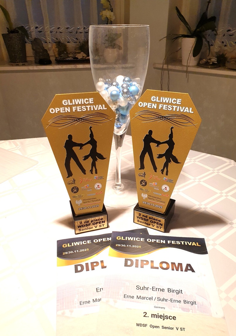 Es dauerte noch eine Woche, bis die Ergebnisse des Gliwice Open Festivals auf der Website des WDSF endlich als „confirmed“ gekennzeichnet wurden und in die Weltrangliste einflossen. Obwohl Birgit und Marcel erst fünf von sechs internationalen WDSF-Turnieren bestritten haben, die in die Wertung eingehen, sind sie mit ihrem jüngsten Resultat auf Platz 29 der Weltrangliste vorgerückt und damit aktuell zweitbestes deutsches Paar in diesem World Ranking. Ein gelungener Abschluss des internationalen Tanzsportjahres 2025!